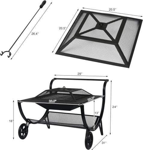 [Fire Pit On Wheels]Equipped with 2 big wheels and 2 support feet, this portable fire pit can be easily moved to anywhere or stop somewhere. It is very convenient and easy to transport. The long side handle is also convenient for moving.[Safe & Warm Bonfire Experience]Bring the glow of the northern lights to your own patio sanctuary with the warmth of a hand-crafted outdoor wood burning fire pit. From roasting summer smores to warming up on a cool autumn night and beyond, a steel fire pit is a great way to make the most of any patio or deck.[Built-In Log Rack]The built-in heavy-duty firewood rack is hand-forged from solid iron, strong and durable. The storage underneath made it easy to keep the mess from the wood contained in one spot.[Heavy Duty Material]The wood fire pit is constructed from 0.7-millimeter thick steel(better than 0.5mm)and finished with high-temperature resistant black finish, and each part is connected with premium metal hardware. Featuring a spark screen which prevents wayward embers from escaping.[Reliable Customer Service]: If for any reason you are unsatisfied, just let us know and we'll fix it. Contact our Amazon service team: Login your amazon account > choose "Your orders" > find the order ID > click "Contact seller".
